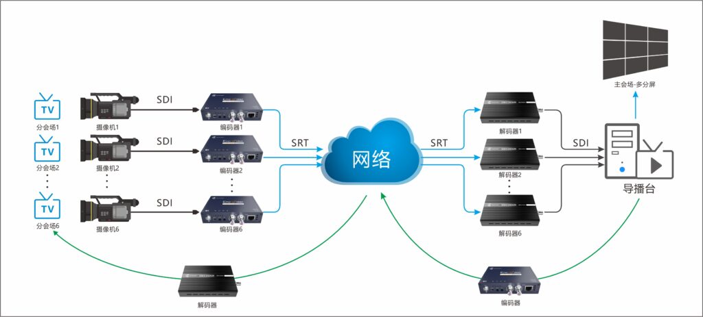 本次会议主会场设置在娄底经开区,现场部署了6台SRT解码器和1台SRT编码器,配置了固定公网地址。其中SRT解码器用于接收6个远程分会场视频提供给现场导播台,导播台则将分会场网络视频和主会场现场视频,制作成1个完整的节目信号,通过SRT编码器发送到6个分会场,同时在现场大屏在线播出。在娄星区、万宝新区等其他6个分会场,为每个分会场配置1台SRT编码器和1台SRT解码器,分别用于发送现场视频和接收主会场视频。在整个会议当中,主、分会场现场画面均清晰流畅,音视频互动延时低,效果好,现场直播团队和技术方案受到了主办方的一致认可。