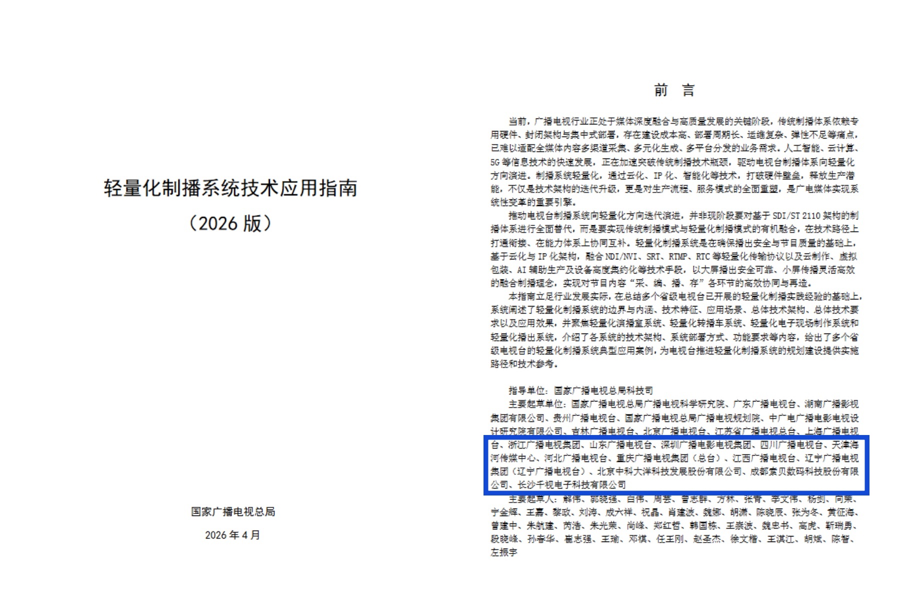 近日,国家广播电视总局正式发布《轻量化制播系统技术应用指南(2026 版)》(以下简称《指南》),为全国广电媒体轻量化、IP 化、智能化制播体系建设提供权威指引与实施路径。长沙千视电子科技有限公司作为主要起草单位深度参与指南编制,多项核心技术、产品方案与典型案例被纳入官方范本,成为轻量化制播技术路线的标杆企业,再次彰显千视在广电视听传输与 IP 化制播领域的行业领军地位。