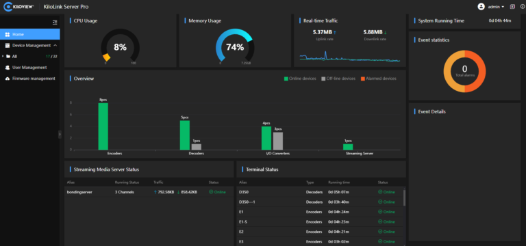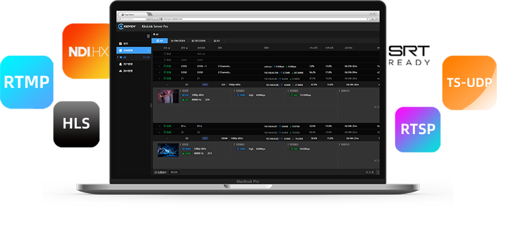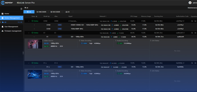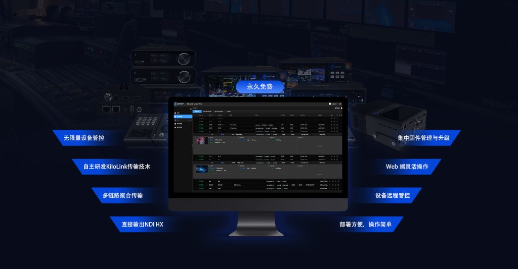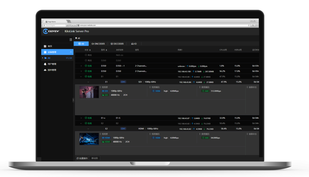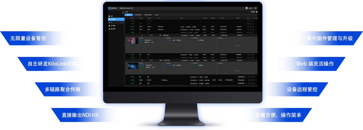 KiloLink Server Pro 正式版将设备聚合服务与集中管理功能完美融合,为用户提供一站式便捷操作体验。用户只需接入 KiloLink Server Pro,即可轻松管理所有连接设备。无需安装客户端软件,兼容 Chrome、Edge、Safari 等主流浏览器,用户可随时通过网页端直观查看设备状态、配置设备参数、访问设备后台、监控聚合链路状态、管理流媒体服务、查看流状态、固件升级及管理,以及一键重启和复位。KiloLink Server Pro 助您轻松掌控全局,成为您的专属设备管家!