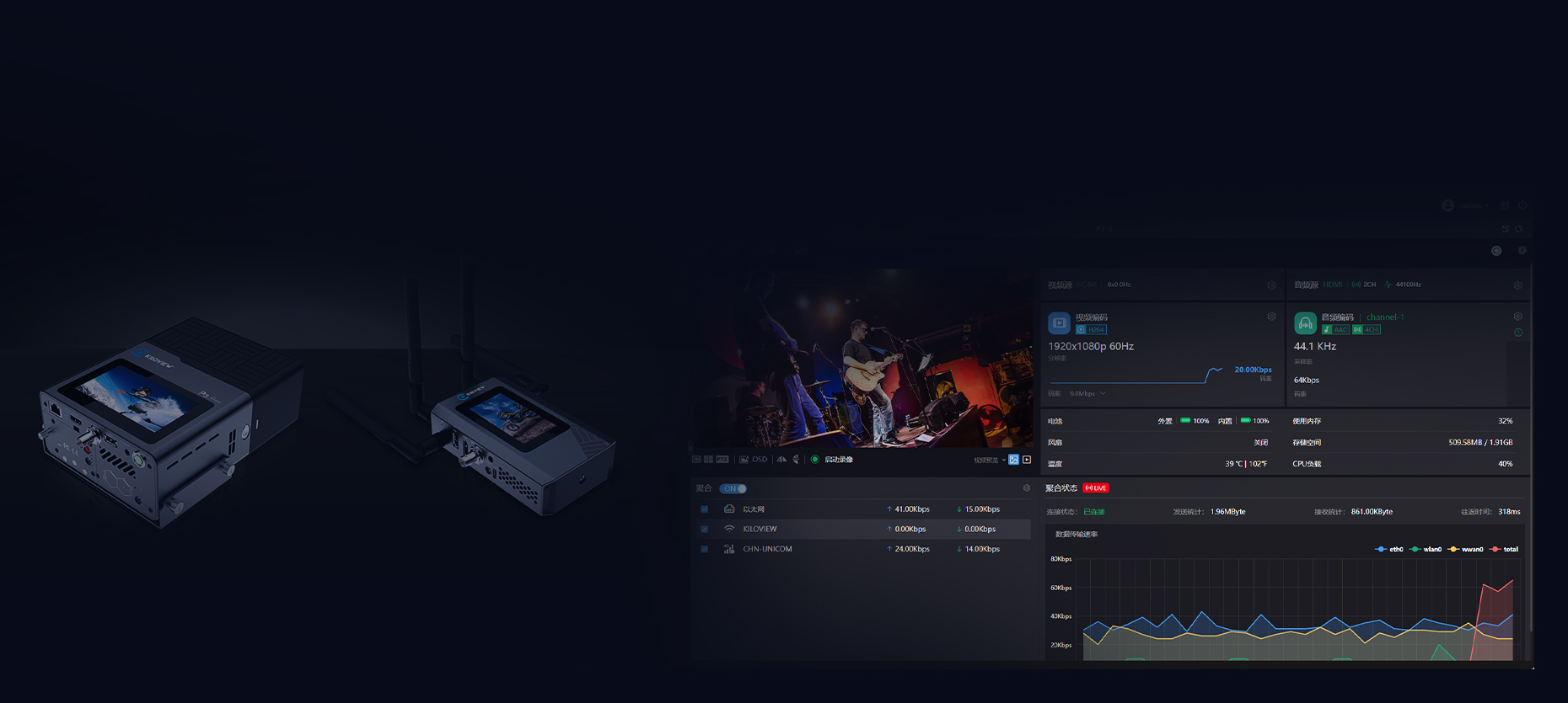 KiloLink Server Pro依托千视自主研发的KiloLink聚合算法技术,能实现高稳定性的多链路聚合传输能力。能够灵活组合将5G/4G模块、WiFi模块及以太网等多种网络链路,通过加密算法实现带宽叠加、自适应负载均衡和动态码率调节自动校准,确保即使在复杂多变的弱网环境下也能稳定传输数据。此外,用户可以在后台自定义缓冲时间,以确保直播过程中不会出现卡顿问题。