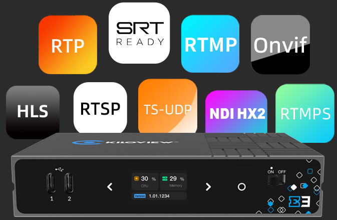 E3 支持 NDI HX2/HX3、SRT、RTMP/RTMPS、HLS、TS over UDP、RTP、RTSP、Onvif 以及 WHIP 等主流媒体协议,可实现最多 8 路 IP 流同时推送,强大的多协议兼容能力确保在各类直播平台及专业 IP 化音视频传输场景中,信号稳定可靠、操作灵活高效。