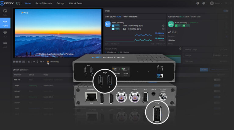 E3 可实现局域网内通过 NDI HX 进行低延时传输,也可凭借 SRT 传输完成远程制作,是一款全面满足音视频IP话传输的理想设备。Kiloview E3 是一款新一代专业视频编码器,将强大性能与灵活性融为一体。它配备 HDMI(最高支持 4Kp30)、3G-SDI(最高支持 1080p60)和 USB 输入,支持 H.264(AVC)和 H.265(HEVC)双编码格式,可分别对 HDMI 或 SDI 视频编码,或将两路信号混合为画中画(PIP)/并排画面(PBP)进行编码输出。