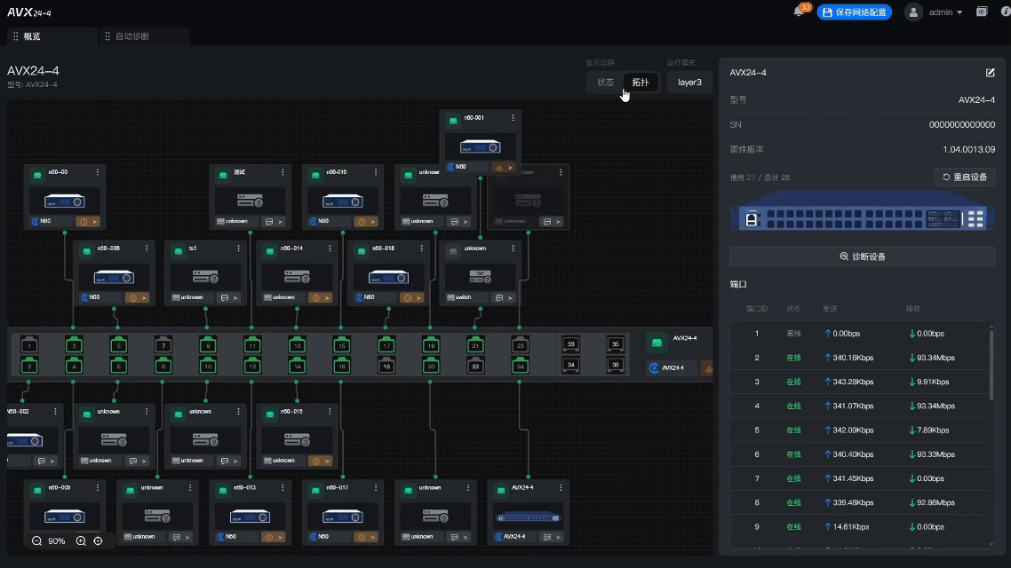灵活的拓扑视图: 自动识别所有在网设备并生成拓扑视图,支持AV网络布局自由缩放预览。设备状态管理: 支持设备自定义名称与场景化按键标识,实时显示设备在线状态、视频源信息及编码格式、帧率等关键参数,媒体信息清晰可辨。端口级状态指示: 过12种色彩状态指示灯,直观展示端口连接状态、供电模式、数据传输质量及异常告警信息。