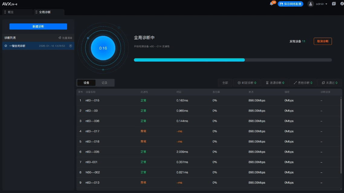 AVX Media HUB支持对媒体流传输关键指标的全方位诊断与监测。通过实时数据采集与深度分析,确保诊断结果的全面性与可靠性同时,将传统运维的被动响应转变为主动预防,降低故障响应的时间,提高系统风险预警能力。● 全局诊断&端到端诊断:可实现对全局或特定设备的连通状态、传输时延、数据丢包以及上下行带宽等关键指标的分析,满足了从大规模设备巡检到关键链路深度排查的全场景应用。● 硬件级端口监测:借助FPGA在硬件层面实现对端口状态的严密监控,能够迅速精准捕捉并获取任何异常事件的详细信息,为潜在风险提供早期预警。●自动告警:自动捕获异常事件并生成详细结构化诊断日志,为持续性地对媒体流状态进行监控和维护提供了坚实有力的数据支撑。