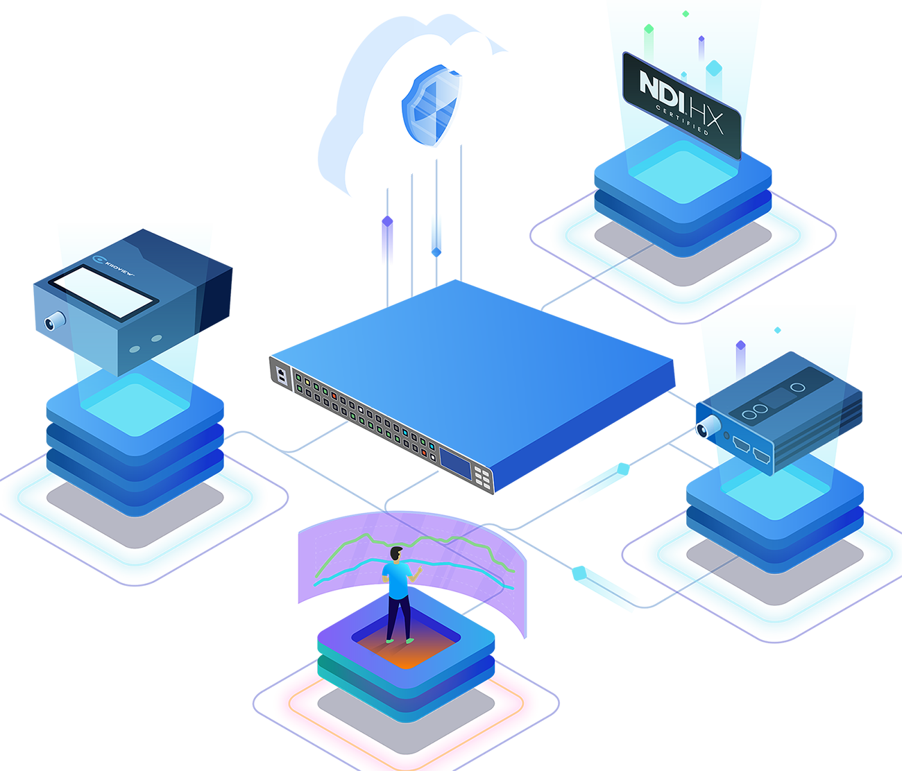 千视(Kiloview)基于深厚的 AV-over-IP 技术积累与持续创新,打造面向 Pro AV 场景的 IP 媒体管理平台——AVX MediaHub。平台深度整合信号管理、可视化拓扑、智能诊断、媒体级矩阵切换、PTP 精准同步与集中化设备管理,实现 IP 媒体网络的简化、可视化与可控化,跨越 IT与NDI的鸿沟,赋能每一次传输。AVX MediaHub 支持多路 NDI/IP 信号的无缝切换,内置 FPGA 加速、QoS 优先级调度、PTP 精准同步、实时端口监控与异常预警,即使在高密度传输场景下,也能保持广播级低延迟与高可靠性。平台支持零配置即插即用、拖拽式路由、预设场景与一键诊断,并可与 KiloLink Server 协同实现集群化管理,使 AV 操作人员无需 IT 背景即可轻松构建、管理并掌控完整的 AV-over-IP 网络。