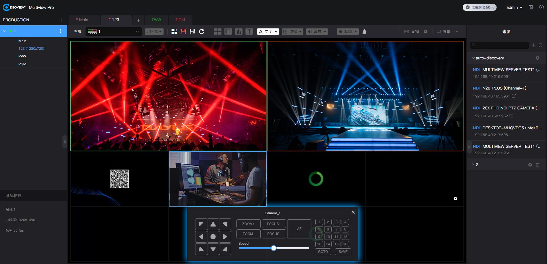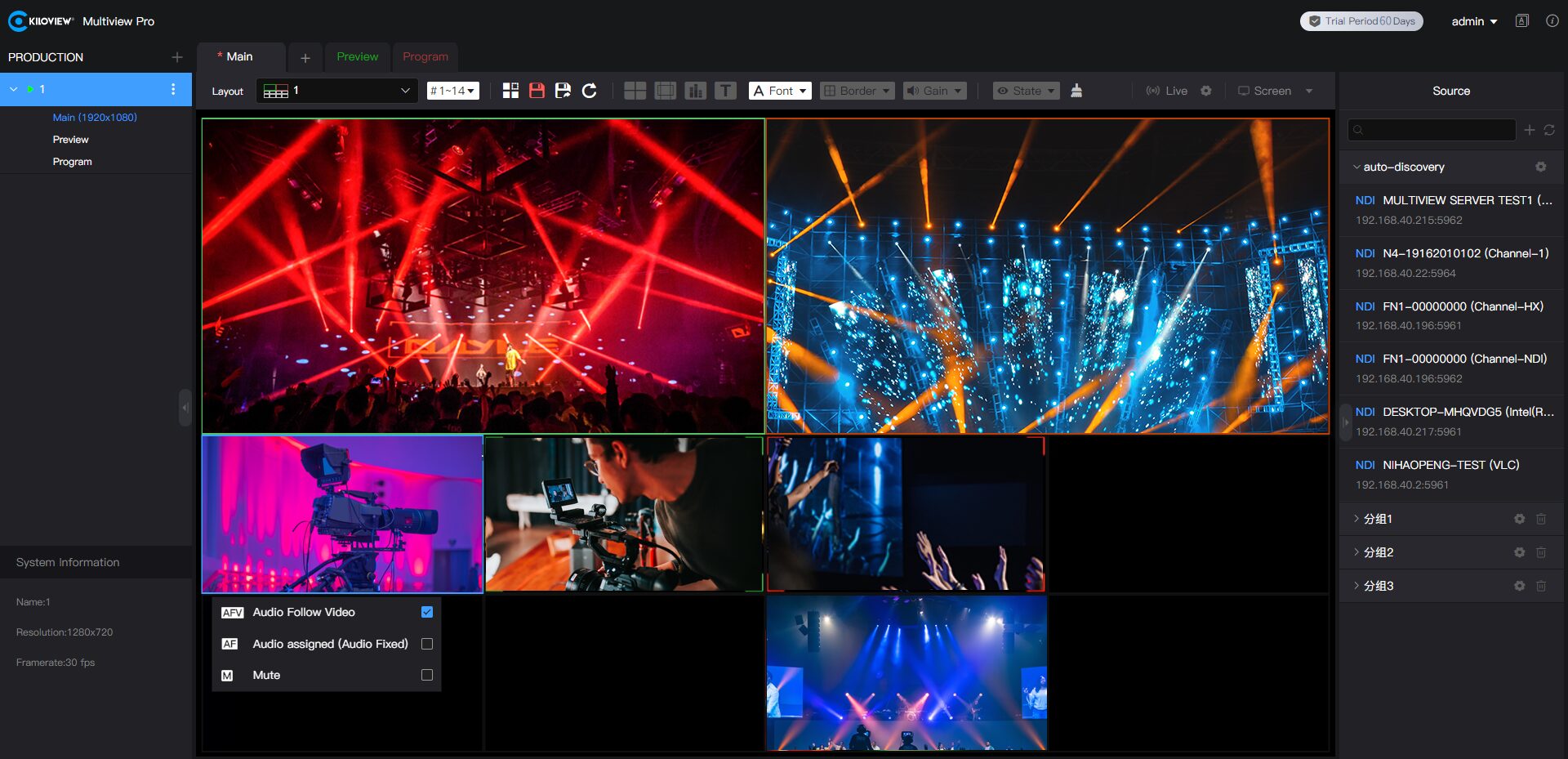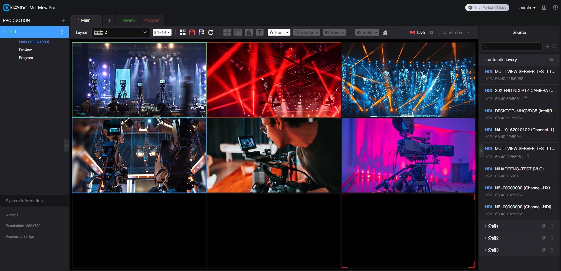 Multiview Pro 支持“PVW预监+PGM切换”模式,用户可根据需求自定义设置切换时间和多种切换效果,设置好后点击Take键,即可将PVW视频画面无缝切换为PGM进行监看,也可转换为NDI流输出,每个主窗口的内容即可是单画面输出也可多画面输出。Multiview Pro同时支持 实时 Tally 信号发送:精准指示播出状态。 “先预览,后播出”的工作流程,确保监看效果一目了然,关键操作万无一失,助力实现高效、精准的专业级制作与播出。
