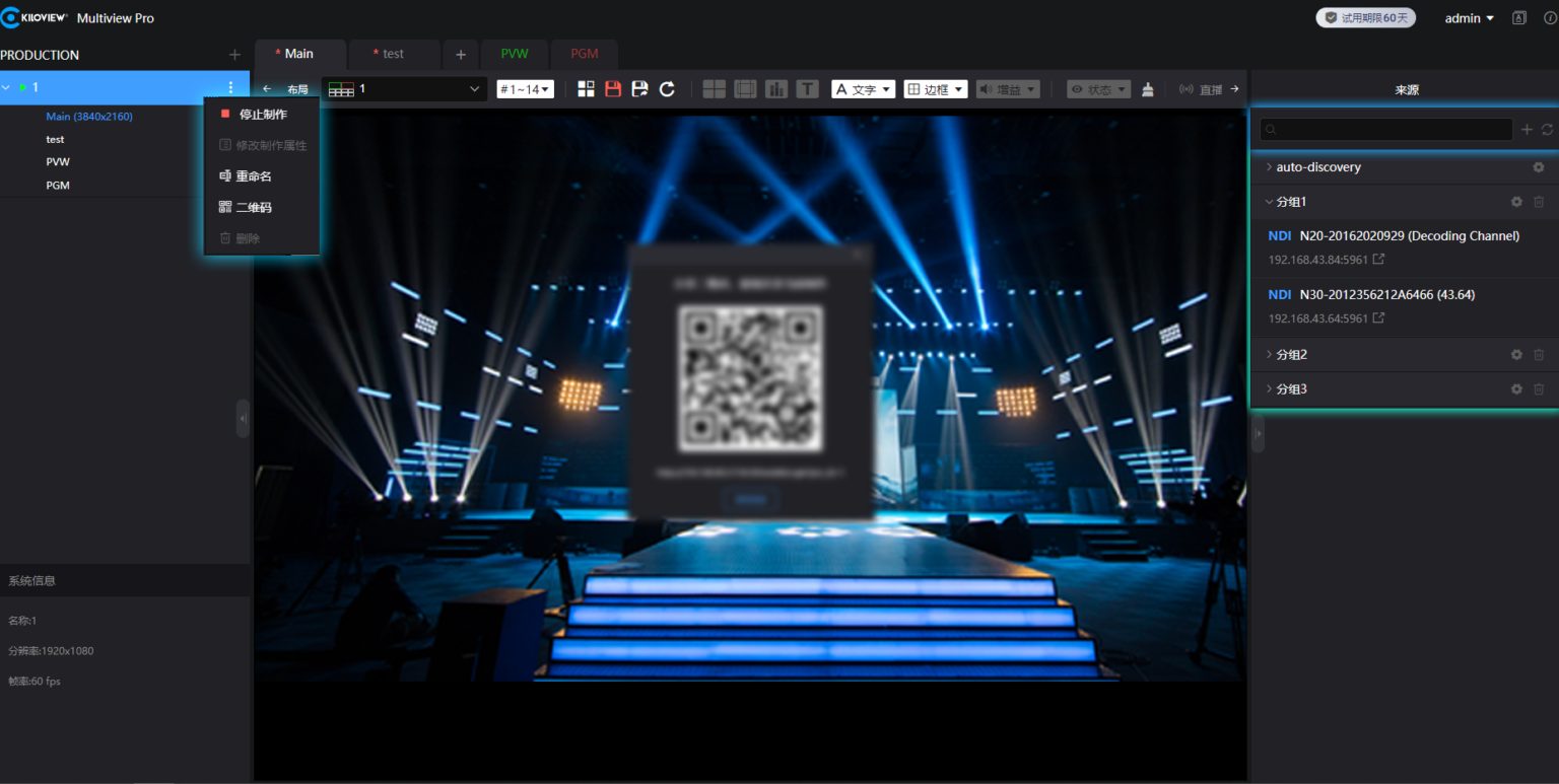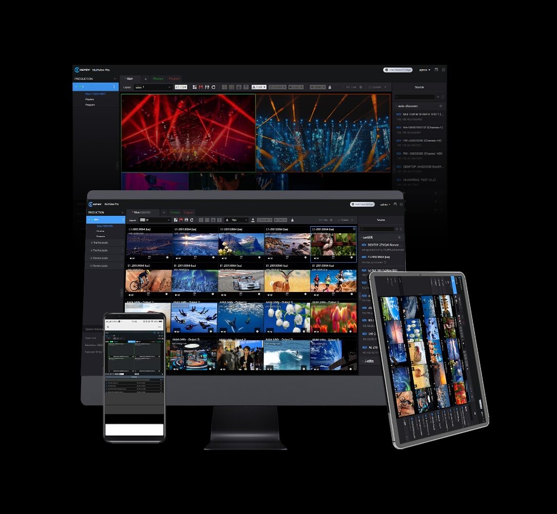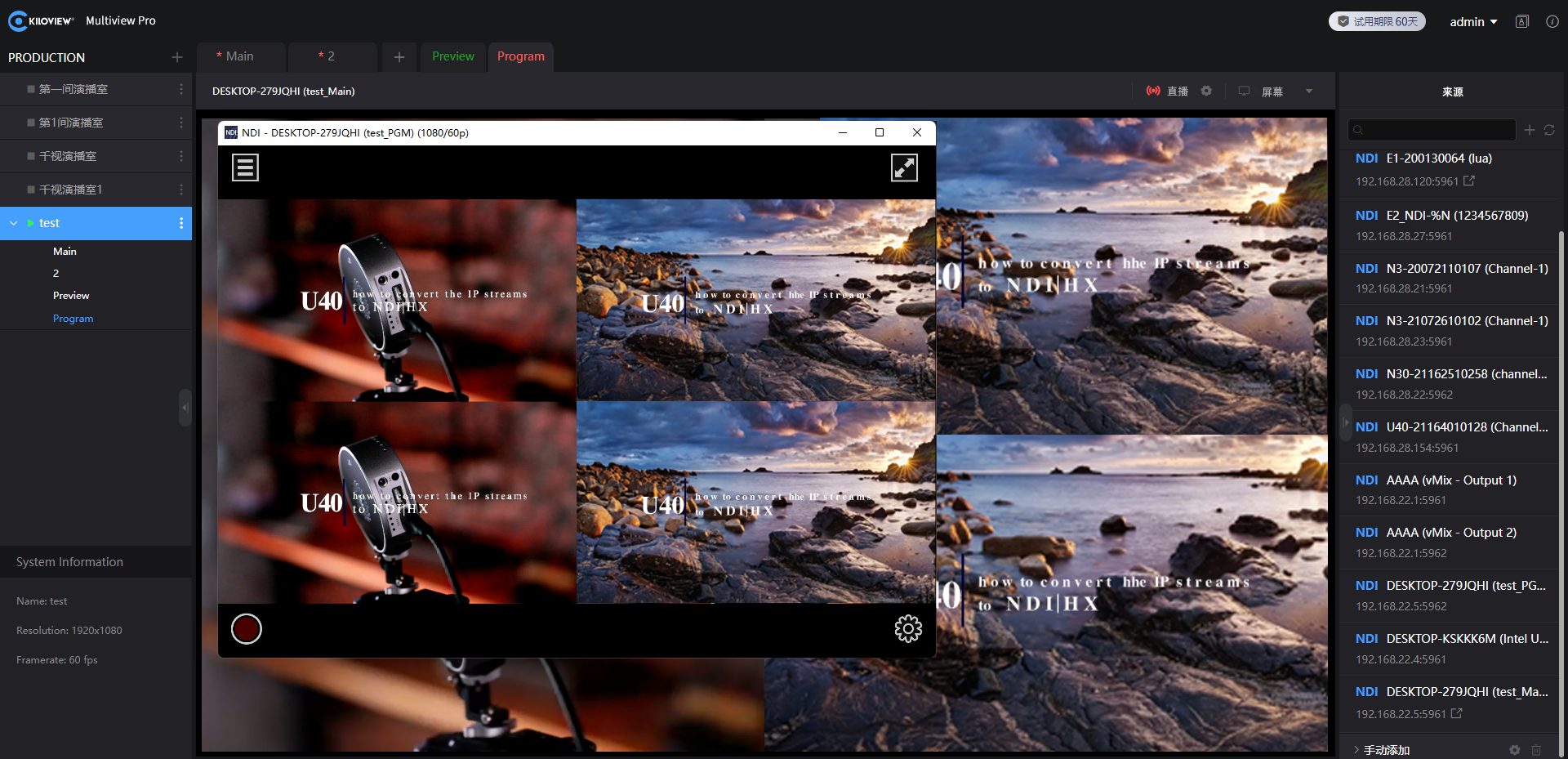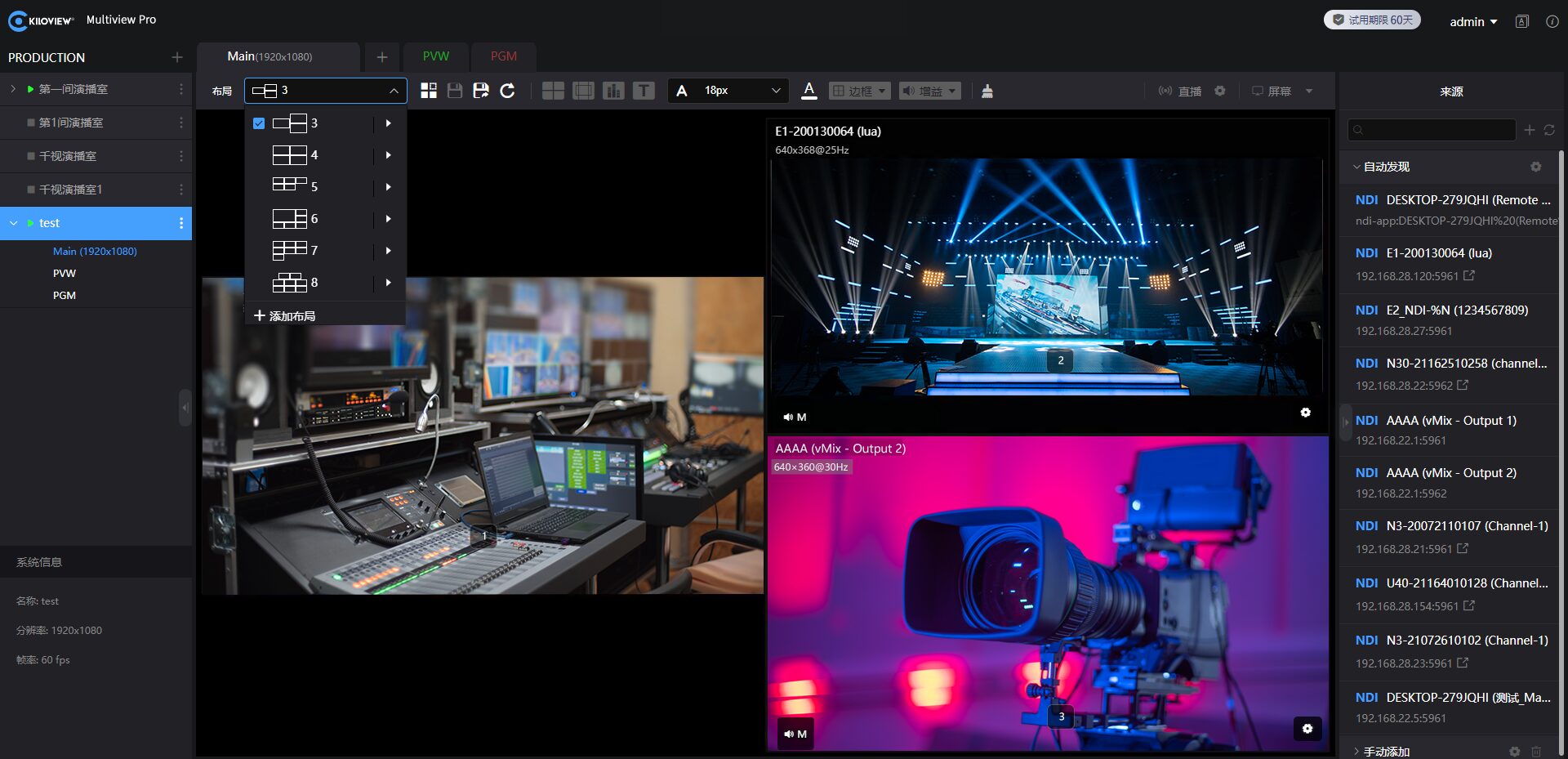 Multiview Pro 支持“PVW预监+PGM切换”模式,用户可根据需求自定义设置切换时间和多种切换效果,设置好后点击Take键,即可将PVW视频画面无缝切换为PGM进行监看,也可转换为NDI流输出,每个主窗口的内容即可是单画面输出也可多画面输出。Multiview Pro同时支持 实时 Tally 信号发送:精准指示播出状态。 “先预览,后播出”的工作流程,确保监看效果一目了然,关键操作万无一失,助力实现高效、精准的专业级制作与播出。