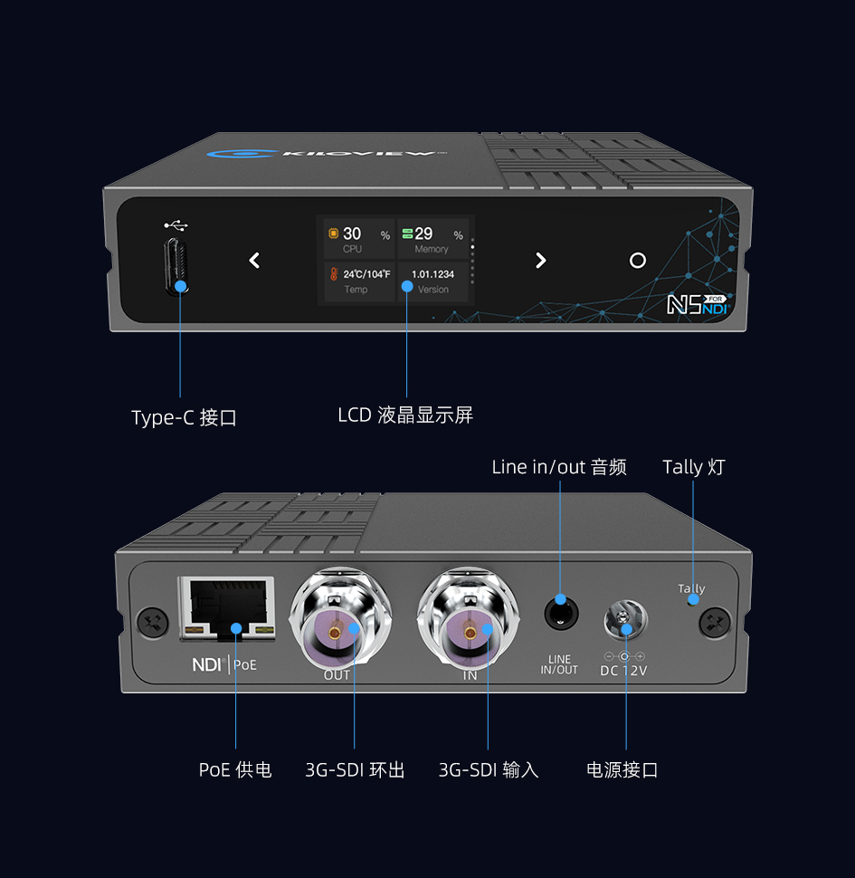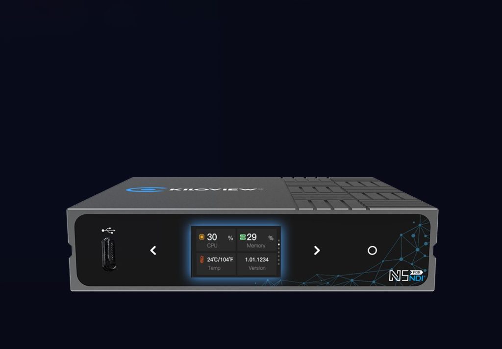 Kiloview N5是一款专为广电行业打造的全功能 NDI 编解码设备, 集3G-SDI输入/环出和USB视频转换于一体的全能NDI编码解码器。无论您需要编码还是解码,支持高带宽NDI和轻量级NDI HX/HX3格式,这台设备都能一机搞定,简化设备采购和部署难题。凭借高性能、灵活的接口和多协议兼容,N5适用于广播、会议、教育及远程制作等多种场景,是您进入NDI生态的经济实惠首选。