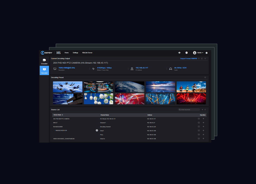 N5支持最多10路视频源的实时预览,在输出前即可清晰监看解码画面与视频信号状态,实时显示分辨率、IP 地址、色彩格式、音频采样率、码率与帧率等关键信息。注:预览数量受网络带宽及环境影响,可根据实际情况进行配置。