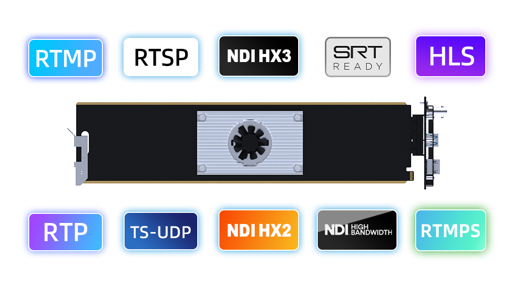 媒体协议支持NDI High Bandwidth/NDI HX/HX3/SRT/RTMP/RTMPS/ HLS/TS over UDP/RTP/ RTSP