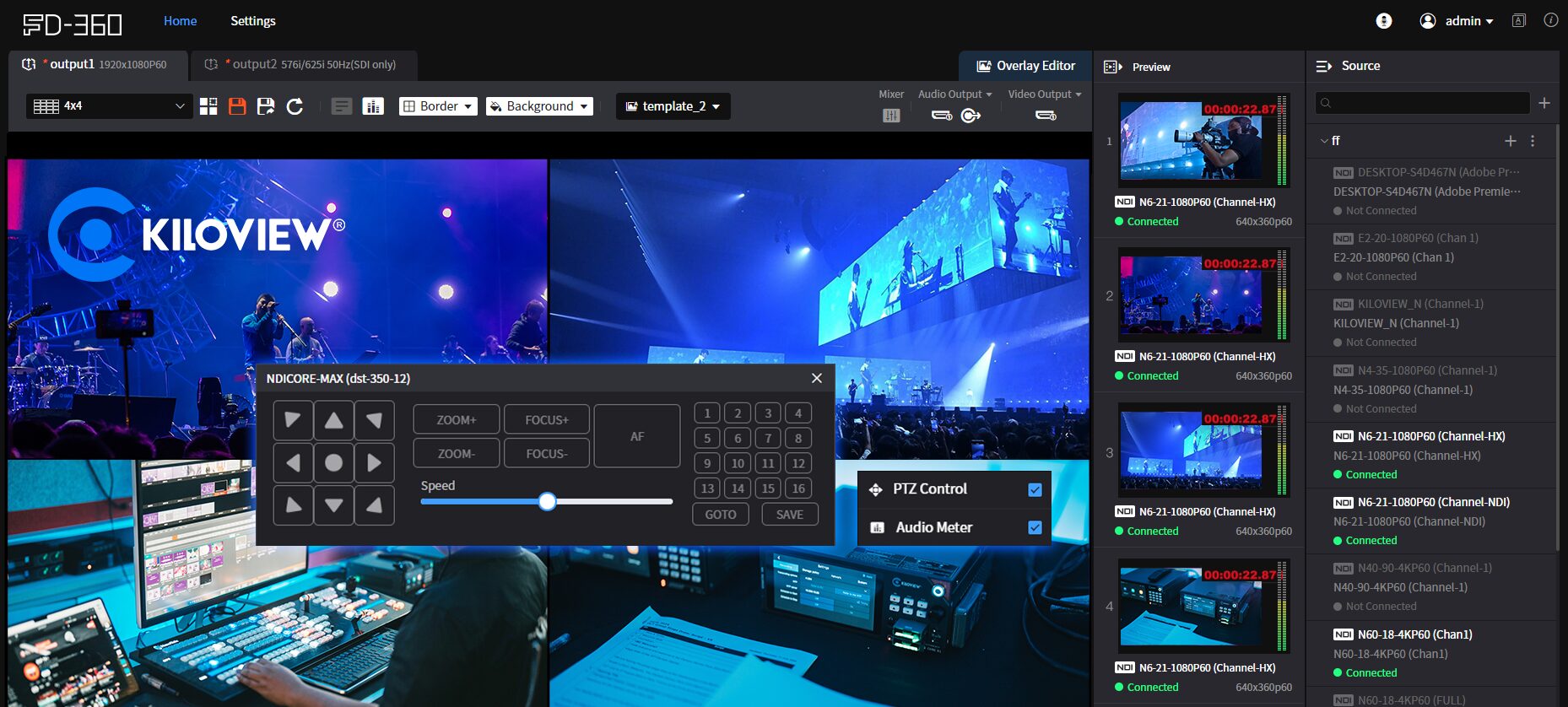 FD-360支持多达16画面实时预览,能预览本地及跨网络的IP 视频流,并可以灵活切换预览内容至输出画面,满足多信号监看与展示场景多样化需求。