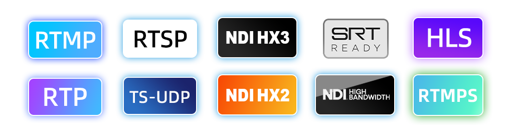 支持 NDI HB/HX2/HX3/SRT/RTMP/RTMPS/HLS/TS over UDP/RTP/RTSP 等全协议解码,满足多种业务场景。