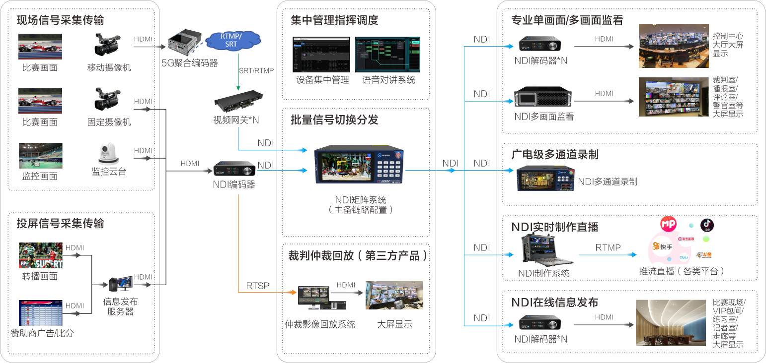 • 信号多样且覆盖广泛:需接入监控视频、云台摄像机、固定机位、计时记分、广告推流等上百路信号,并分发至控制中心、裁判席、观众区等多个区域。
