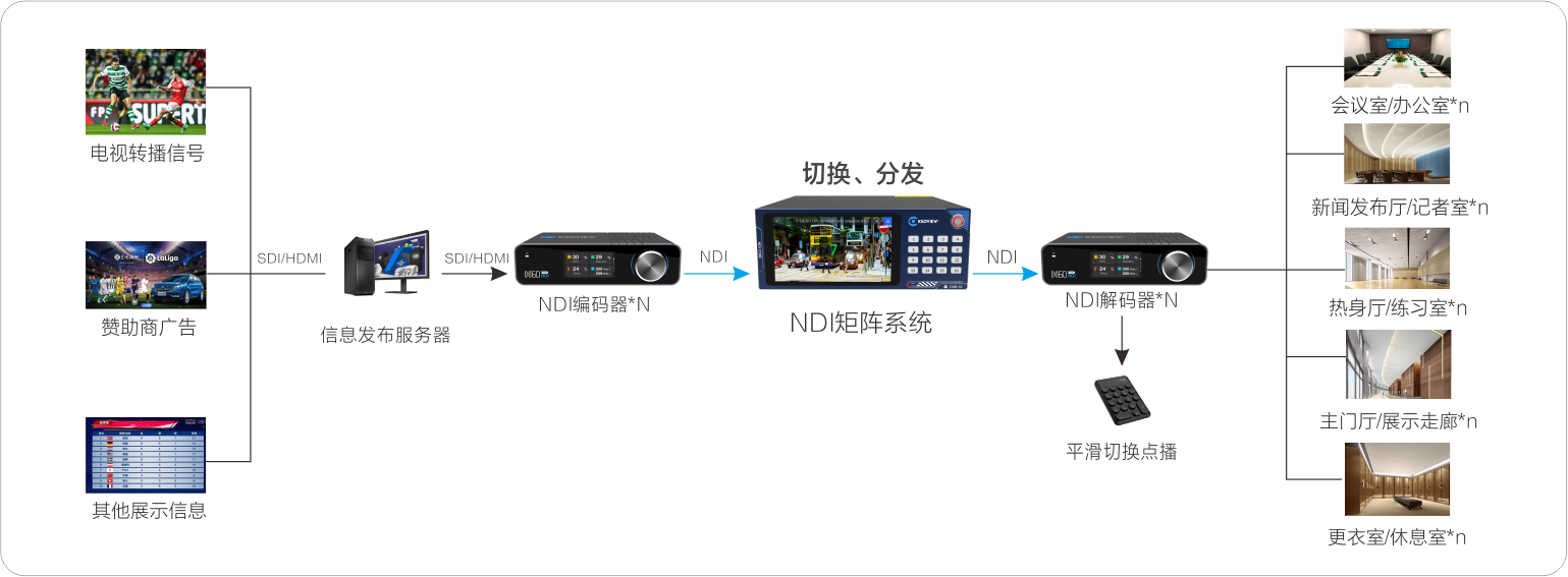 通过NDI矩阵系统集中管理和切换所有信号源,并按需分发至中心大屏、新闻厅、会议室、VIP包间、更衣室、练习室、走廊过道等各区域的NDI解码器。